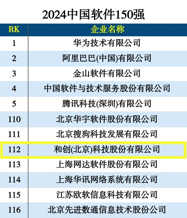 2024年10月24日,在中國科學院旗下權威媒體《互聯網周刊》與德本咨詢等機構聯合發布的“2024年中國軟件150強”榜單中和創科技榮幸地被評選為中國軟件行業的杰出企業。該榜單依據嚴謹的評估體系,從技術實力、市場地位、服務質量、發展潛力、社會影響、行業貢獻及管理效率等多個維度進行評定,確保評價的公正性和權威性。這一殊榮不僅是對和創科技在軟件開發和技術創新領域的認可,也標志著公司在數字化智能云服務領域的持續進步。