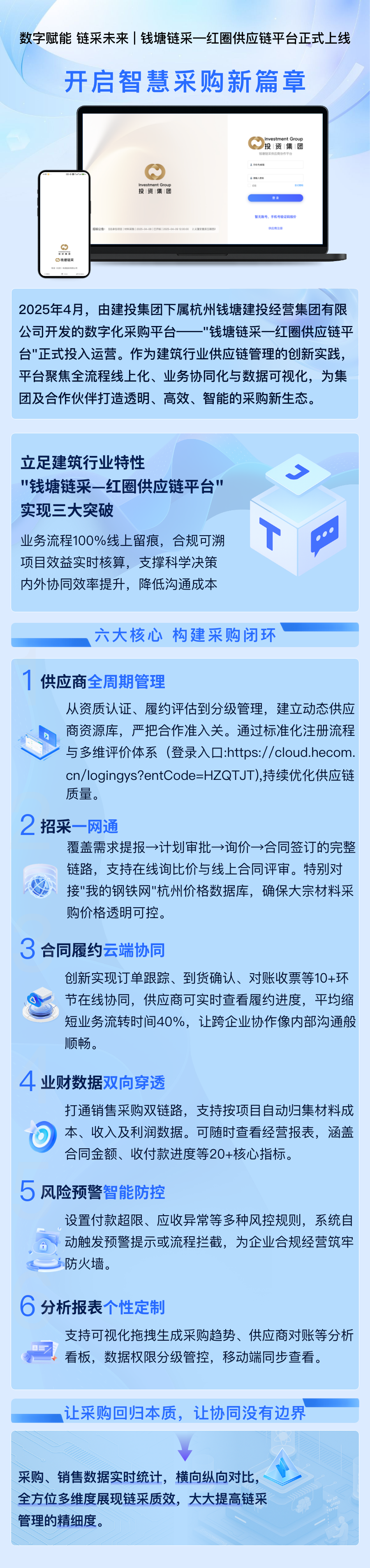 合作企業(yè)?|?錢塘建投經(jīng)營集團(tuán)—紅圈供應(yīng)鏈采購管理平臺正式上線,開啟智慧采購新篇章