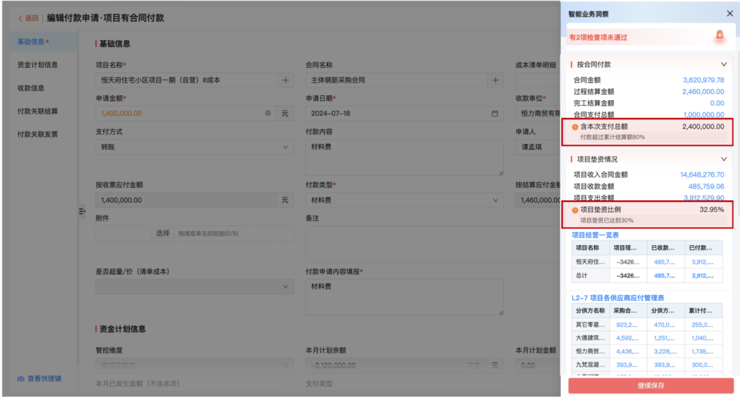 通過系統(tǒng)實(shí)時(shí)看得到公司資金情況,明確知道哪些項(xiàng)目能有資金去做去投資、哪些資金要計(jì)劃對(duì)外結(jié)算支付,項(xiàng)目現(xiàn)在開了多少票、還有多少錢沒有回,同時(shí)也能對(duì)進(jìn)度款、質(zhì)保金、投標(biāo)保證金等回款設(shè)置提醒,防止逾期未回。項(xiàng)目墊資情況也能同步關(guān)注,判斷公司的經(jīng)營(yíng)狀況是否穩(wěn)健。