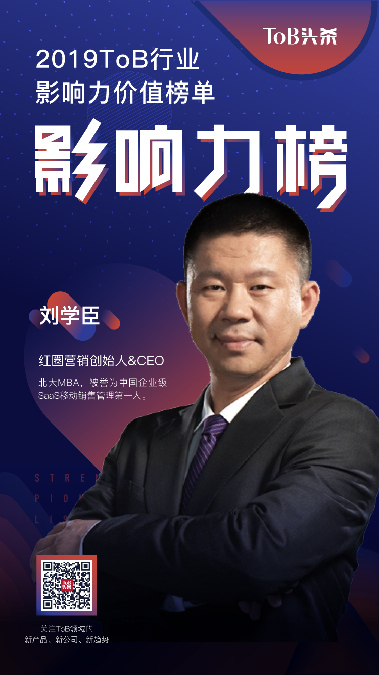 近日,由“ToB行業頭條”主辦的【ToB行業2019影響力價值榜單——人物榜】重磅發布,紅圈營銷創始人兼CEO劉學臣榮登“ToB行業影響力人物榜”。