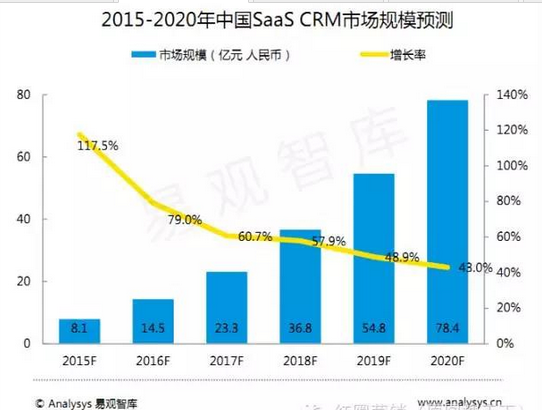 報告指出,國內(nèi)SaaS CRM市場在2014年的增長率達(dá)到了176.9%,市場規(guī)模從1.3億元人民幣增長到了3.7億元人民幣,2015年的增長率預(yù)計達(dá)到117.5%,市場規(guī)模增長到8.1億元人民幣。2015-2020年市場還會保持較高速度增長,但是隨著市場規(guī)模的逐漸擴(kuò)大,增長將趨于平穩(wěn),中國傳統(tǒng)中小企業(yè)的互聯(lián)網(wǎng)化轉(zhuǎn)型將成為市場規(guī)模增長的主要動力,而隨著中國傳統(tǒng)中小企業(yè)互聯(lián)網(wǎng)化轉(zhuǎn)型的逐漸完成,SaaS CRM市場的企業(yè)數(shù)量將保持在一個平穩(wěn)的水平,市場的規(guī)模增長將來源于更加專業(yè)以及更加多元化的產(chǎn)品服務(wù)。