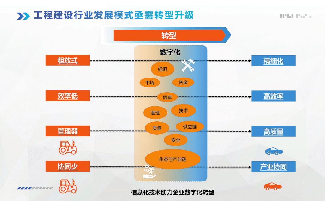 當前行業的現狀是粗放式、效率低、管理弱、協同少,建筑企業的發展模式需要轉型,信息化需要隨著行業的轉型而轉型,要想高質量發展就需要利用信息科技賦能,信息化、數字化的目的是提高精細化、高效率、高質量、促進產業協同(圖2)。