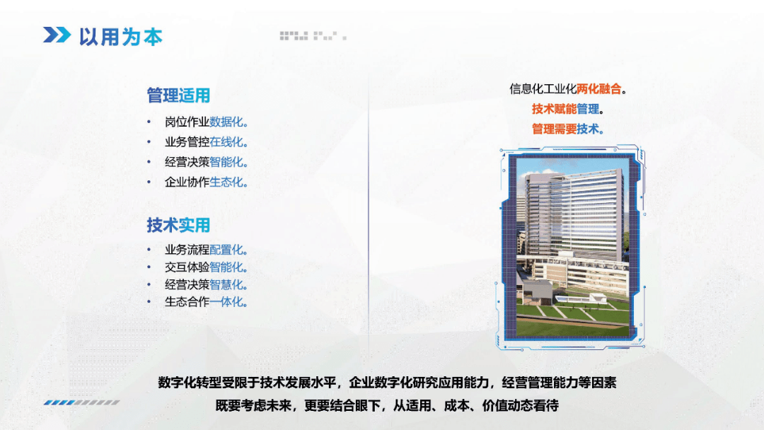 數(shù)字化轉(zhuǎn)型需要以投入產(chǎn)出為考量,以切實幫助企業(yè)經(jīng)營為目標,而不能為了數(shù)字化而數(shù)字化。在信息化與工業(yè)化“兩化融合”的趨勢下,技術(shù)賦能管理,管理需要技術(shù),主要體現(xiàn)在提高工作效率,控制企業(yè)經(jīng)營風險,提高管理能力,降低企業(yè)運營成本等方面。