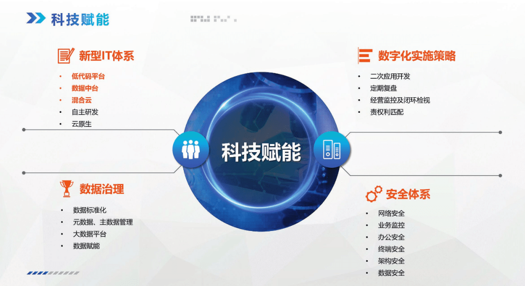 要實現(xiàn)科技賦能,首先要考慮科技賦能的基礎設施,這有四個方面:一是新型IT體系、二是數(shù)據(jù)治理、三是安全體系、四是數(shù)字化實施策略(圖11)。
