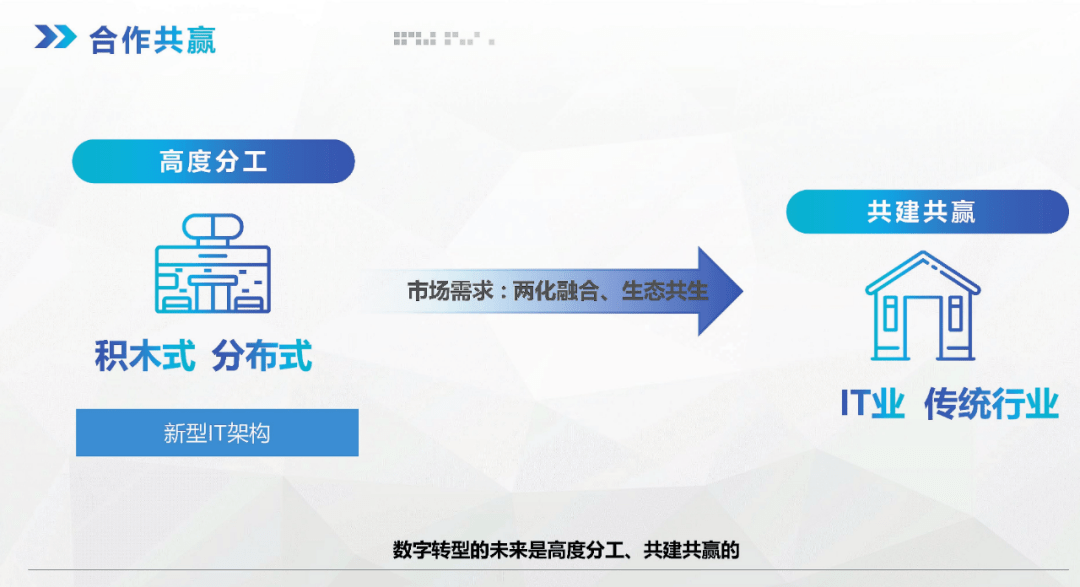 數(shù)字化轉(zhuǎn)型的未來是高度分工、共建共贏的,在新型IT架構(gòu)體系下,未來的系統(tǒng)可以是積木式、分布式的,高性能、高響應、低成本、低門檻將是科學技術(shù)發(fā)展的方向。