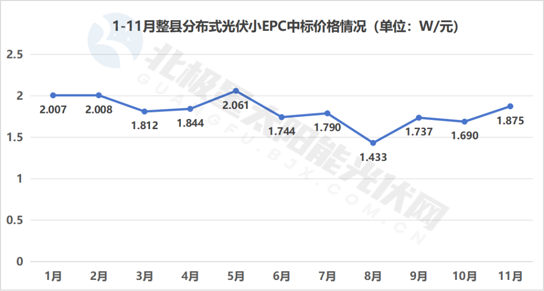 小EPC項(xiàng)目的,中標(biāo)均價(jià)基本穩(wěn)定在2元/W上下,其中,最高價(jià)格2.73元/W出現(xiàn)在1月,項(xiàng)目為秦皇島市海港區(qū)15.27405MWP整區(qū)屋頂分布式光伏發(fā)電項(xiàng)目(二期),最低價(jià)格0.412元/W在8月,項(xiàng)目為上海浦東新區(qū)教育行政事業(yè)單位屋頂分布式光伏建設(shè)項(xiàng)目。