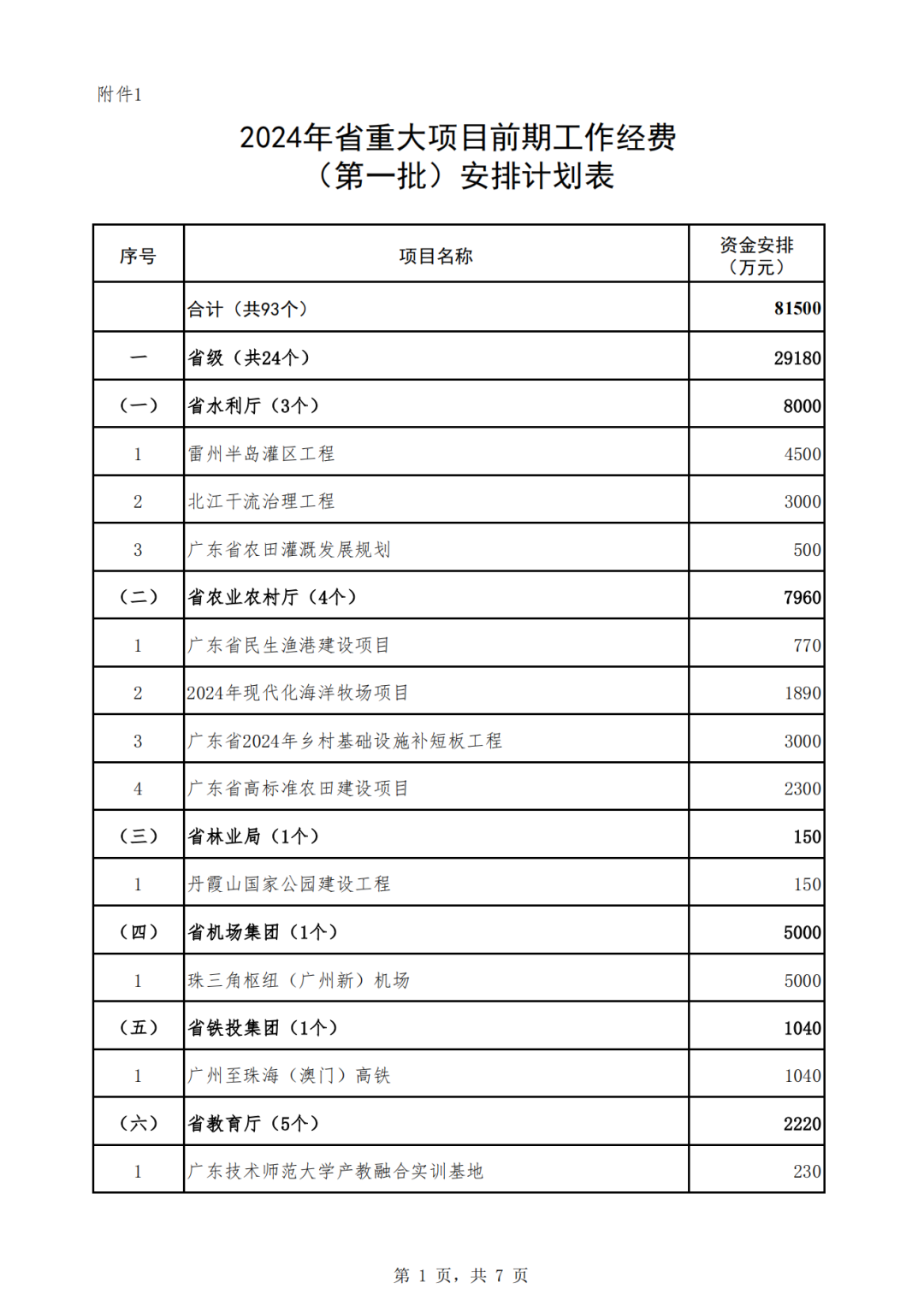 廣東省2024年省重大項目前期工作經費安排計劃(第一批)公示