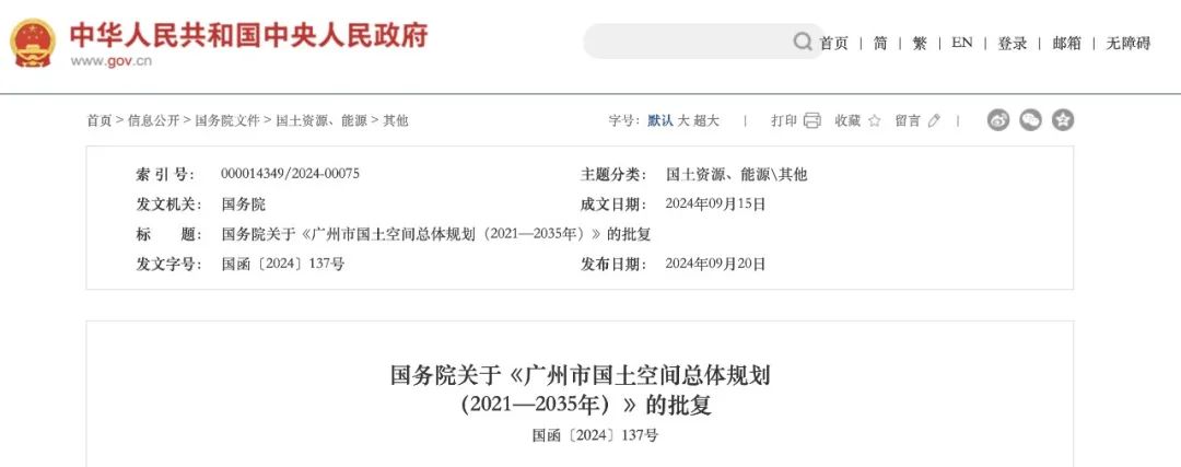 9月20日,國務院發(fā)布關于《廣州市國土空間總體規(guī)劃(2021—2035年)》的批復。