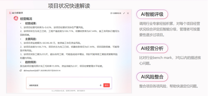 紅圈AI系列智能產(chǎn)品中的項(xiàng)目360°AI解讀,通過整合全維經(jīng)營(yíng)指標(biāo),一鍵生成項(xiàng)目全景作戰(zhàn)圖,讓復(fù)雜數(shù)據(jù)轉(zhuǎn)化為清晰決策語言。該功能能夠?qū)?xiàng)目經(jīng)營(yíng)狀況進(jìn)行智能評(píng)級(jí),并整合各項(xiàng)風(fēng)險(xiǎn),幫助管理者快速定位問題。通過結(jié)構(gòu)化呈現(xiàn)項(xiàng)目關(guān)鍵信息、收支分析、資金分析和成本構(gòu)成等數(shù)據(jù),項(xiàng)目360°AI解讀使項(xiàng)目進(jìn)度監(jiān)控更加精準(zhǔn)高效。這種透明化的進(jìn)度跟蹤,不僅提高了項(xiàng)目執(zhí)行效率,也降低了因延期導(dǎo)致的額外成本。